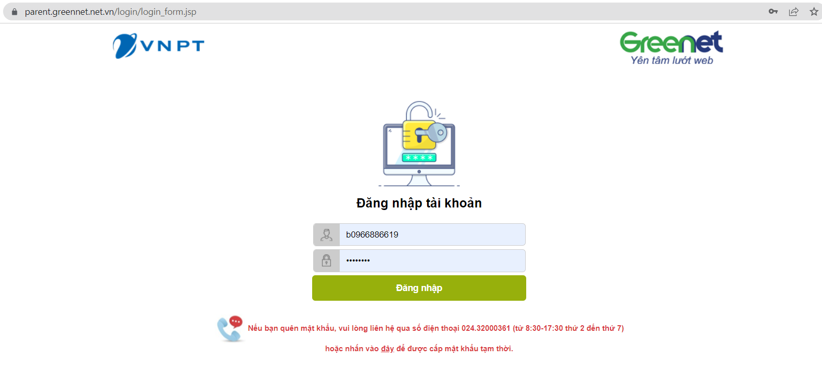 – Người dùng đăng nhập website dịch vụ GreenNet tại địa chỉ: https://parent.greennet.net.vn/login/login_form.jsp