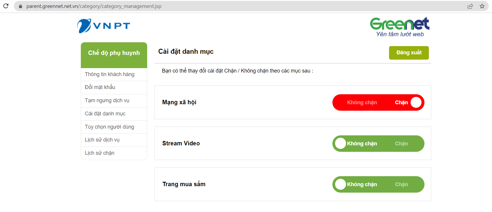 – Hệ thống Greennet hiện cho phép chặn các danh mục được định nghĩa sẵn, bao gồm Mạng xã hội, Stream Video, Trang mua sắm.