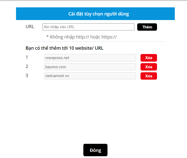 Mỗi Người dùng có thể thêm tùy chọn tới 10 URL :