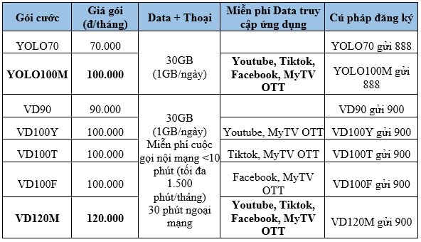 Bên cạnh đó, VinaPhone cũng cung cấp nhiều lựa chọn gói cước hấp dẫn, chu kỳ linh hoạt với ưu đãi miễn phí Data truy cập các ứng dụng mạng xã hội và giải trí được bạn trẻ yêu thích. Đăng ký gói cước YOLO100M chỉ 100.000đ/tháng, các bạn sẽ được “Phá đảo Data” với dung lượng Data không giới hạn truy cập ứng dụng Facebook, Tiktok, Youtube, MyTV. Gói cước còn có thêm 30GB Data tốc độ cao (1GB/ngày) để bạn thỏa sức online.