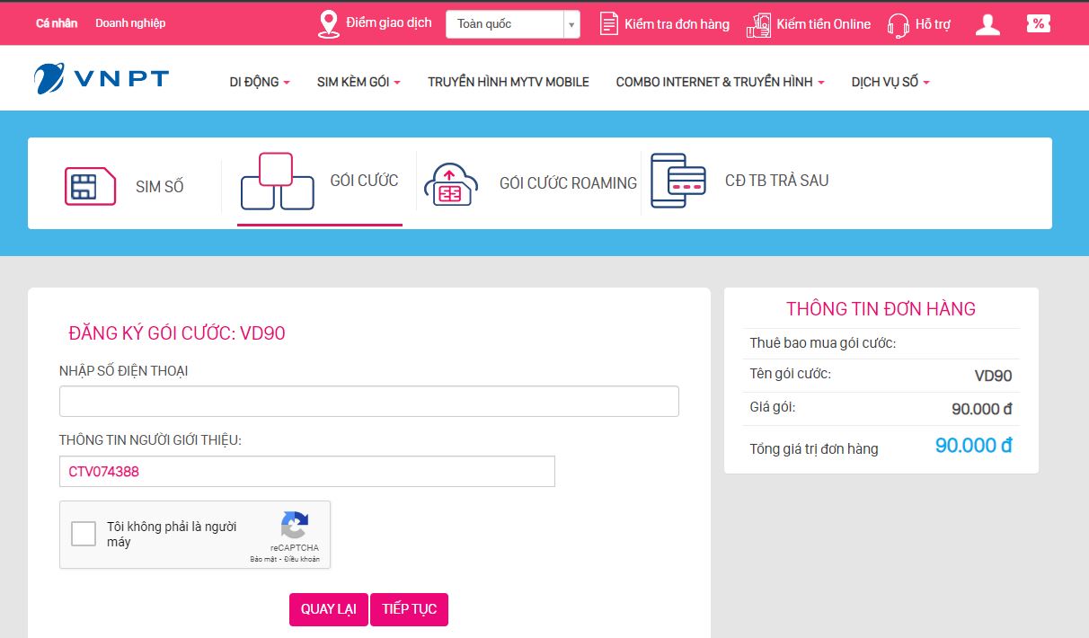Nếu bạn muốn sử dụng ưu đãi của các gói VD90, VD120N và VD150 thì có thể đặt mua sim kèm gói cước theo hướng dẫn sau: