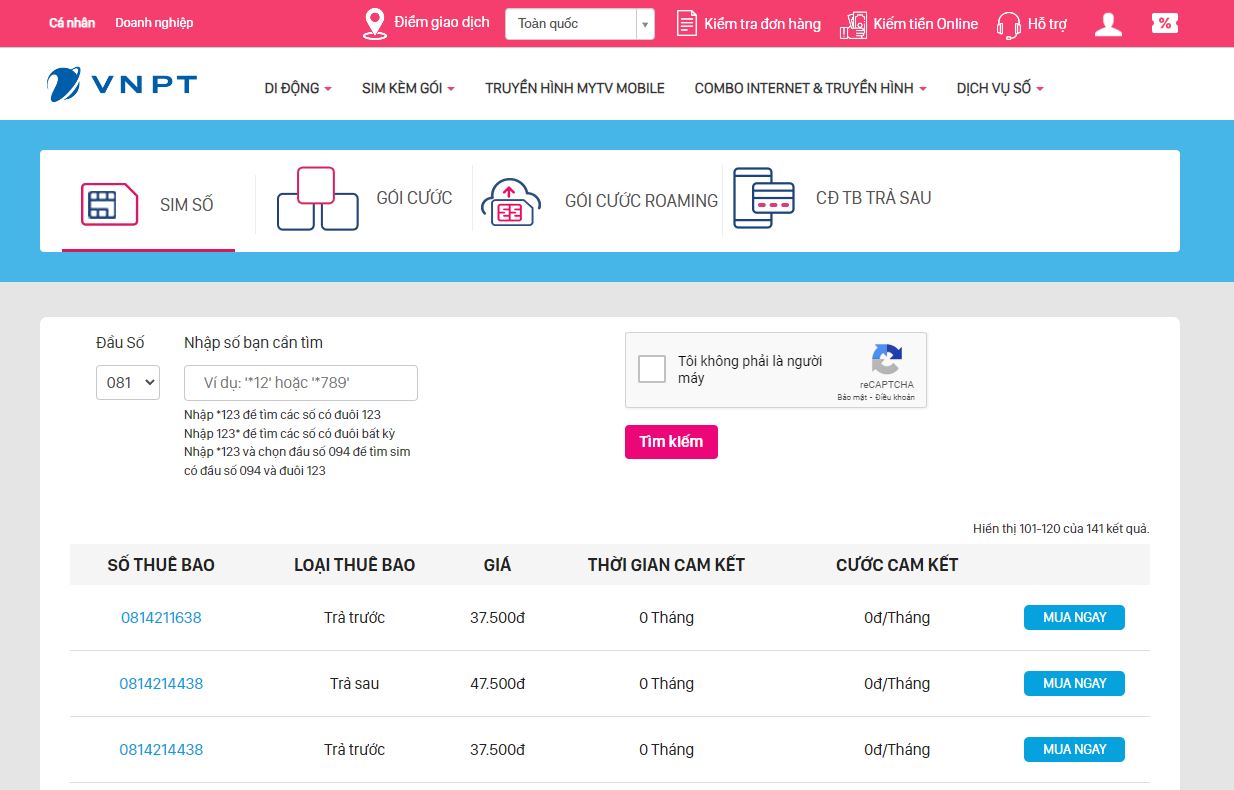 Bước 2: Tìm số máy theo mong muốn bằng cách chọn đầu số (091/094/088/085/084/083/082/081), bấm * kèm số cuối và bấm vào “Tìm kiếm” để tìm số ưng ý.
